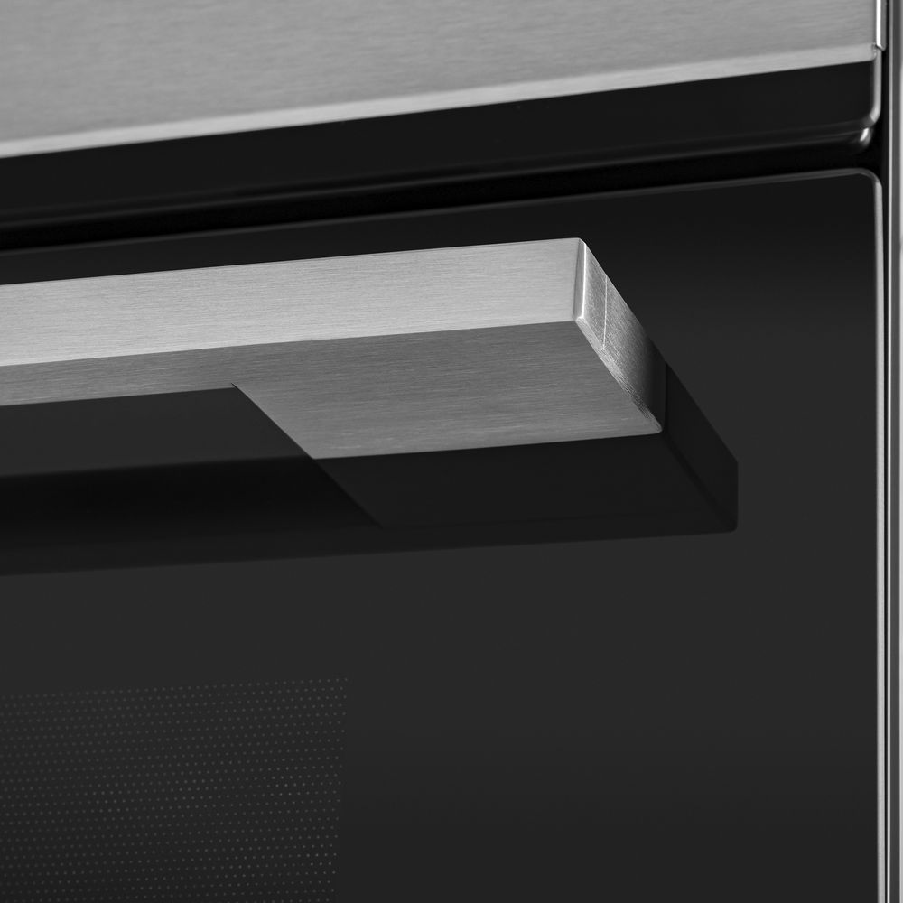 Фронтальная панель дверцы сделана из высококачественного жаропрочного стекла черного цвета, окрашенного по всему объему, что является отличительной чертой бытового прибора премиум-класса. Лицевая часть блока управления, нижняя часть фасада и ручка дверцы выполнены из полированной нержавеющей стали.