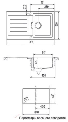 Отводная арматура с переливом и сифоном с возможностью подключения посудомоечной или стиральной машины.
