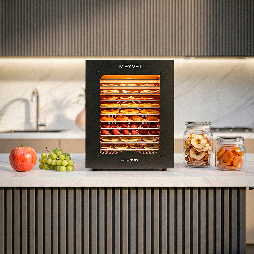 Meyvel MDH12-2S (Чёрный) (Black) — это современный дегидратор, который создан для тех, кто хочет заготавливать фрукты, овощи, мясо, травы и ягоды без потери их вкуса и пользы круглый год. Прочный корпус, продуманная конструкция и умная электроника превращают его в надёжного помощника на каждый сезон.