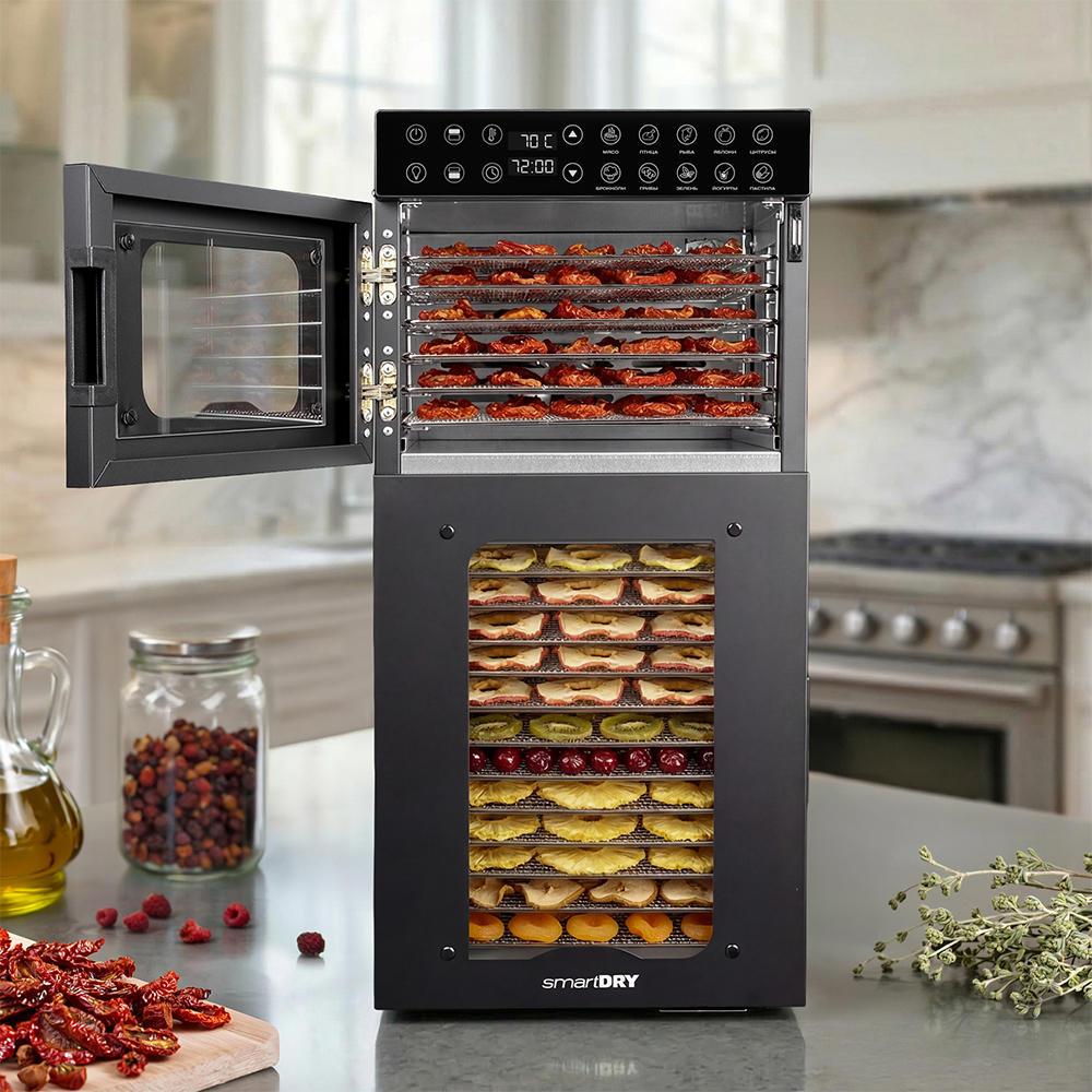 Этот дегидратор оснащён двумя отдельными зонами сушки, в каждой из которых можно установить отдельный режим. Вы можете одновременно готовить разные продукты, задавая для каждой камеры свои параметры температуры и времени. Главное, разница температур между зонами не должна превышать 25°C.