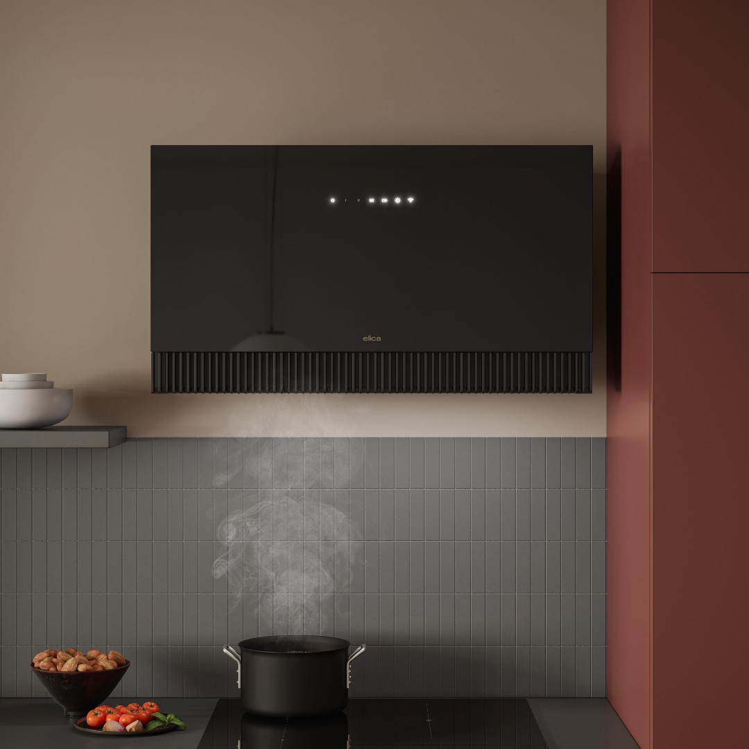 Уникальное сочетание форм и материалов позволяет легко адаптировать вытяжку к любому стилю интерьера, как в качестве отдельного элемента, так и встраивая ее в настенные шкафы. Модель доступна в версии с черным или серым стеклом в сочетании с элементами с эффектом чугуна, что придает изделию еще большую индивидуальность.