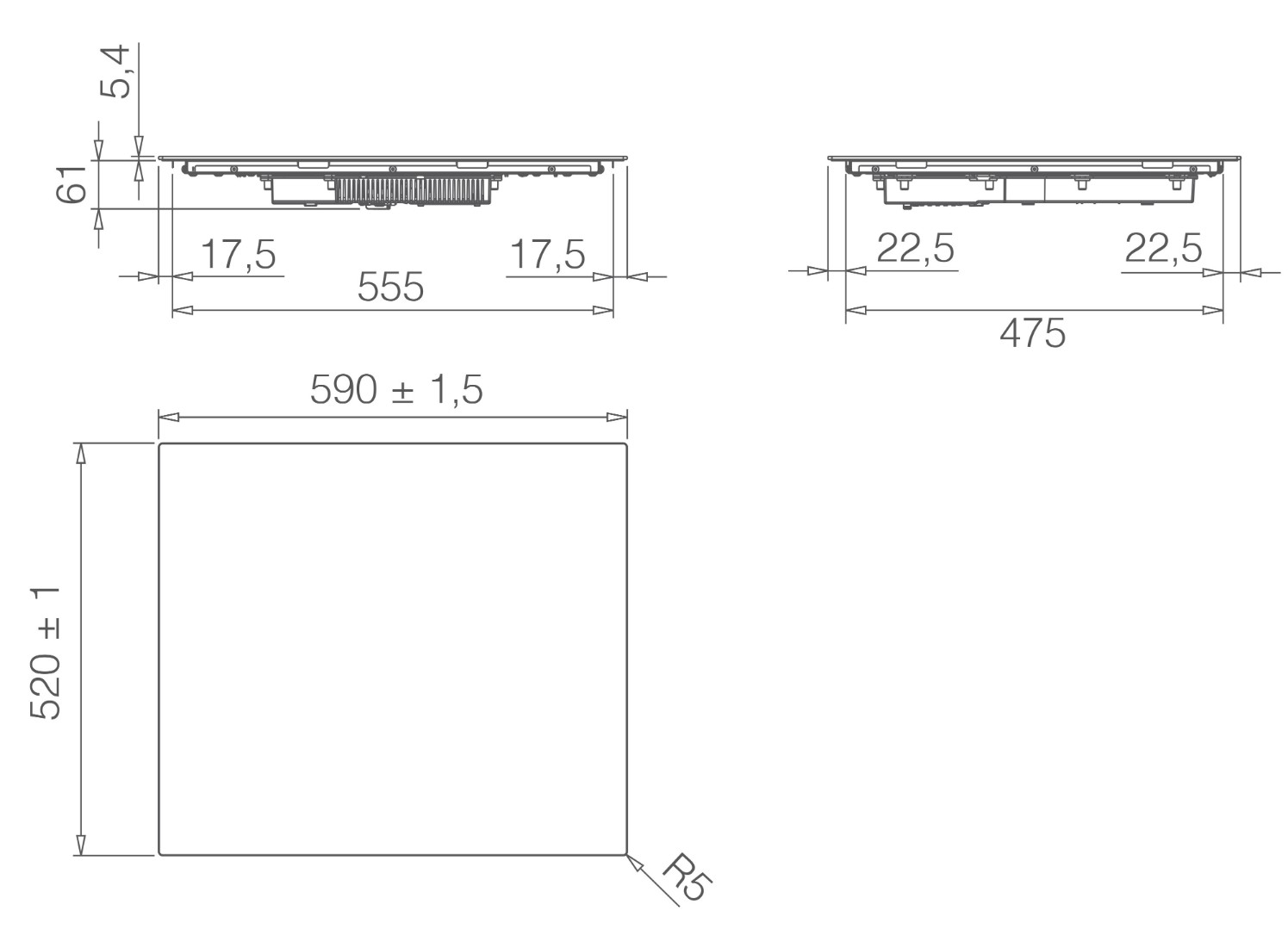 - Ближняя, левая конфорка: Ø 18 cm - 1,5/2,0 kW
