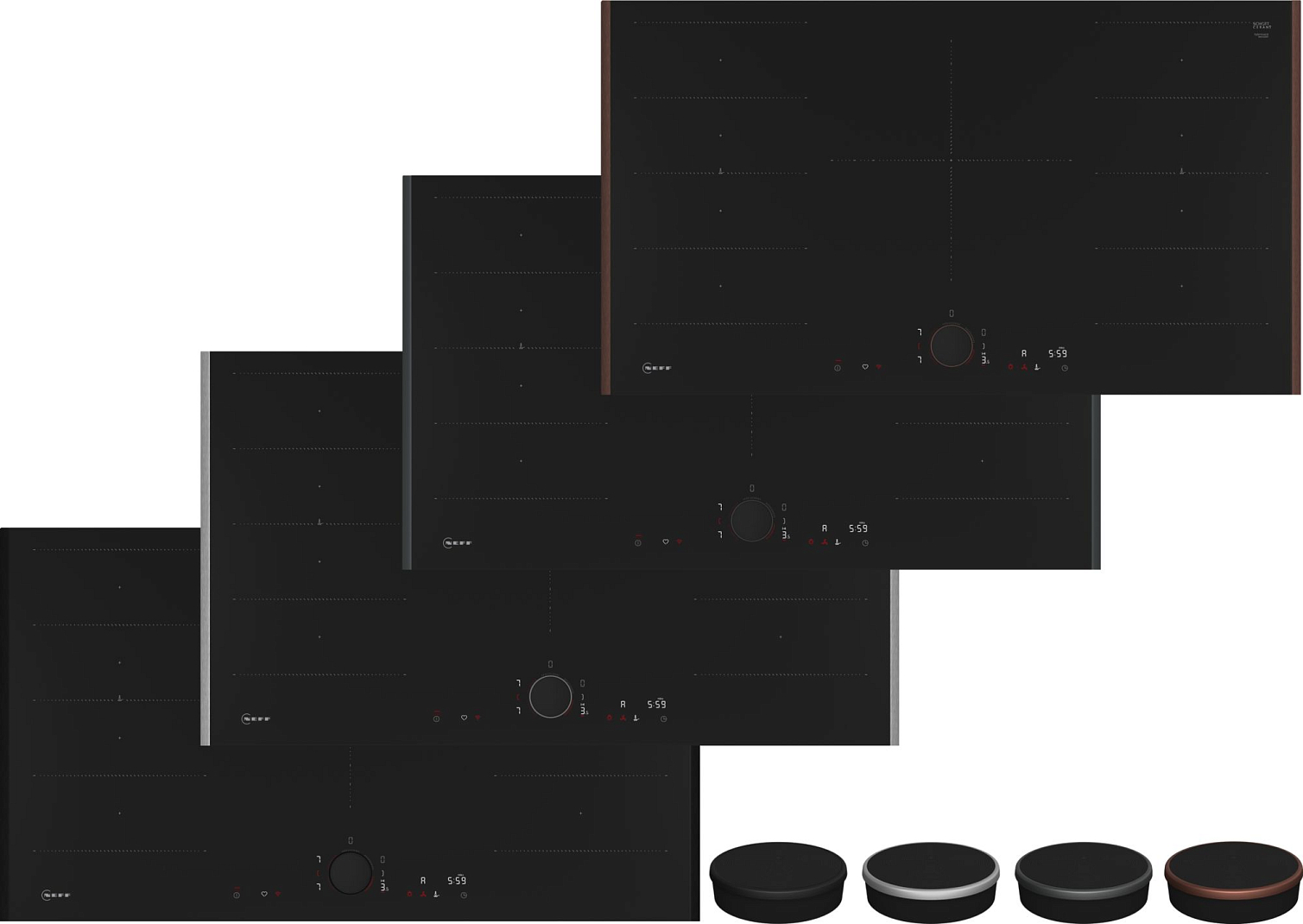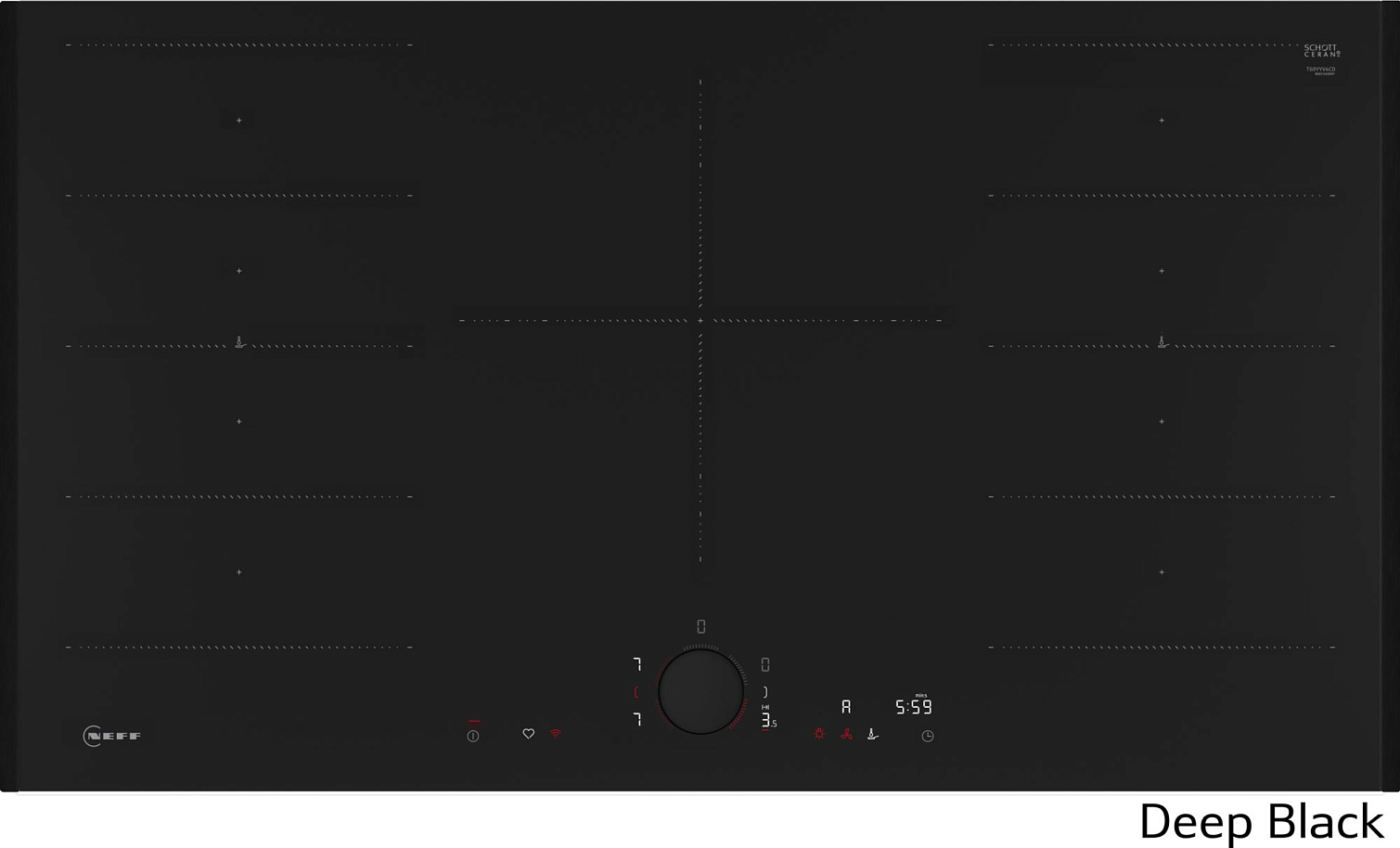 Дизайн варочной поверхности выполнен в стиле NEFF – минималистичный черный цвет, закаленное стекло и отсутствие выступающих элементов делают ее гармоничным дополнением любой кухни.