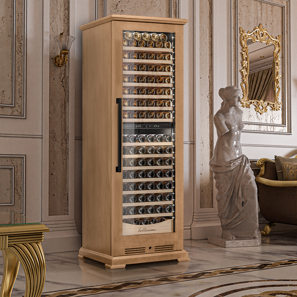 Винный шкаф предназначен для профессионального и длительного хранения различных сортов вин (до 174 бутылок типа Бордо). Он так же оснащен дверью с защитой от ультрафиолетовых лучей и поддерживает влажность в диапазоне 60-80%, как в настоящем винном погребе. Стальной корпус обшит натуральным буком, который выдерживает большие нагрузки и обладает красивой текстурой.
